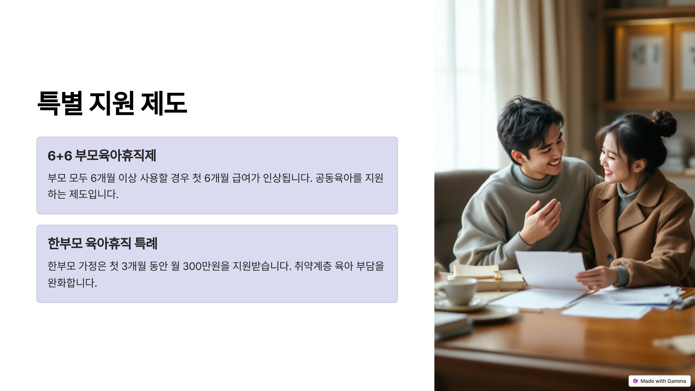 💡 TIP: 맞벌이 부부는 순차적으로 육아휴직을 사용하면 추가 급여(최대 300만 원)를 받을 수 있습니다!