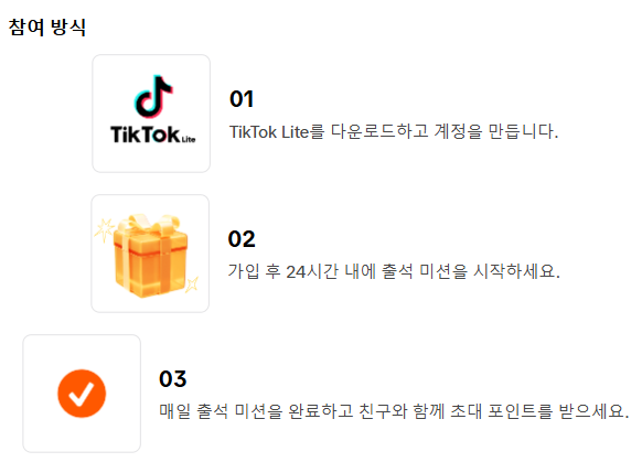 - 친구가 초대 링크로 가입: 초대받은 친구는 링크를 통해 틱톡 라이트를 설치하고, 계정을 생성해야 합니다.